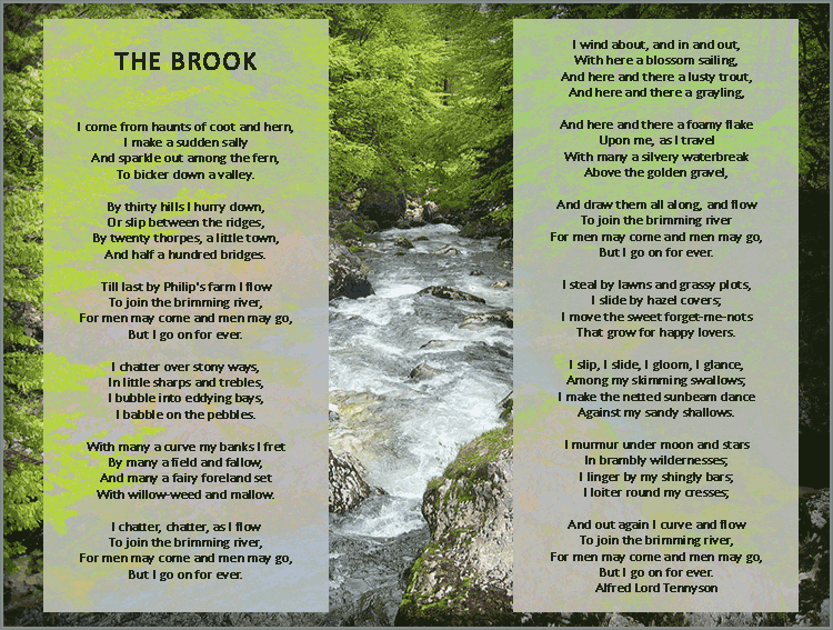 - Life is all-enduring – as is mentioned rightly by Alfred Lord Tennyson in the famous poem, “The Brook” – this song of the brook states that despite the fact that men may come and men may go, the brook goes on forever. It gurgles, sparkles and sings as it flows ceaselessly on its onward journey towards the river, the sea or even the land – whichever comes first. The stream seeps its way into various cracks, crevices and crannies till it finds its rightful path of flowing. This fact implies largely that no one is indispensable on this Earth. We must be humble enough to accept this absolute truth. It’s the message of the Circle of life itself and it cannot be ignored.