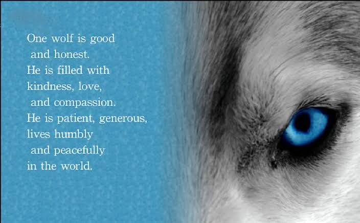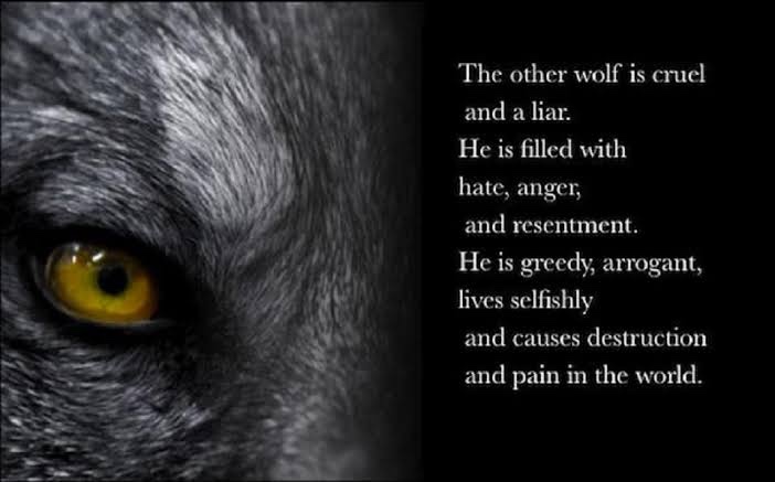 An old Cherokee is teaching his grandson about life. “A fight is going on inside me,” he said to the boy. “It is a terrible fight, and it is between two wolves. One is evil – he is anger, envy, sorrow, regret, greed, arrogance, self-pity, guilt, resentment, inferiority, lies, false pride, superiority, and ego.”