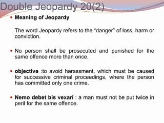 The clause (2) of Art 20 provides that a person cannot be prosecuted and punished more than once for the same offence. The word ‘Prosecution’ under this article consists of three essential components to categorize the concept under this article.